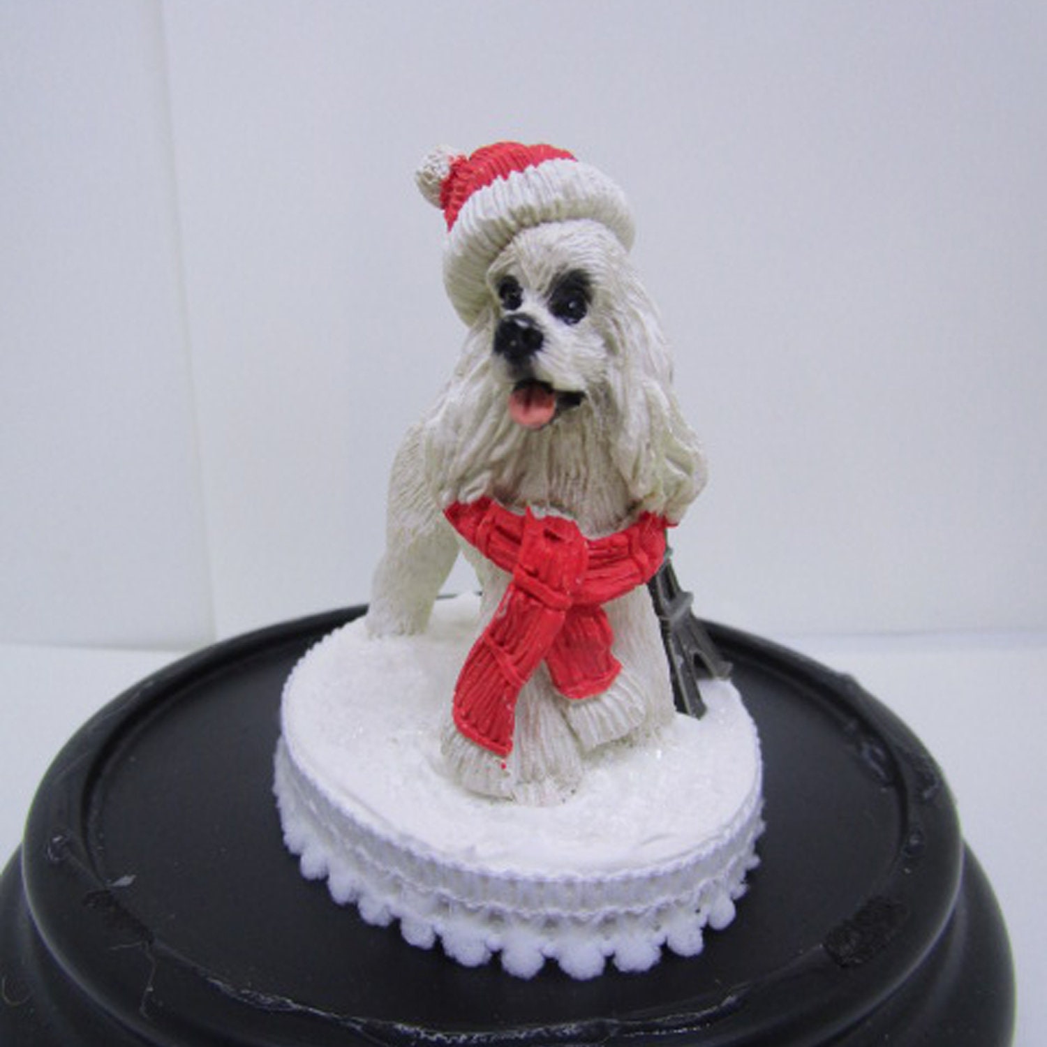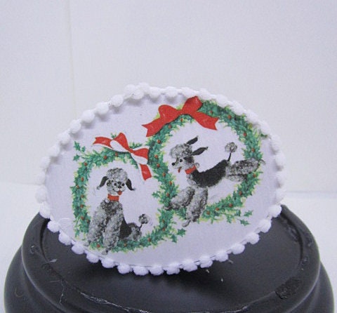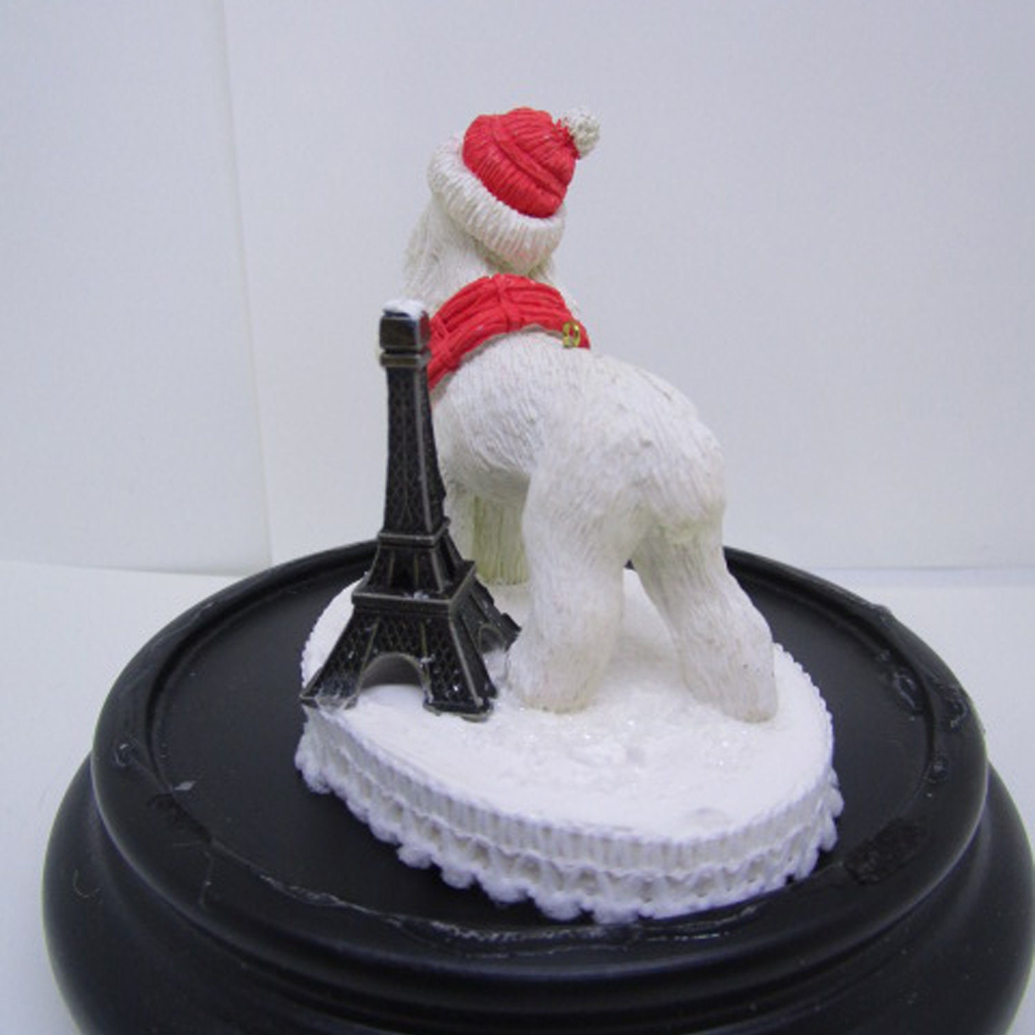 The Standard French Poodle is made of resin. The Eiffel Tower is metal. The base is wood. I added a print of a vintage poodle picture to the bottom and sealed it with decoupage. I put a light coat of artifical snow on the top then wrapped trim around the edge.