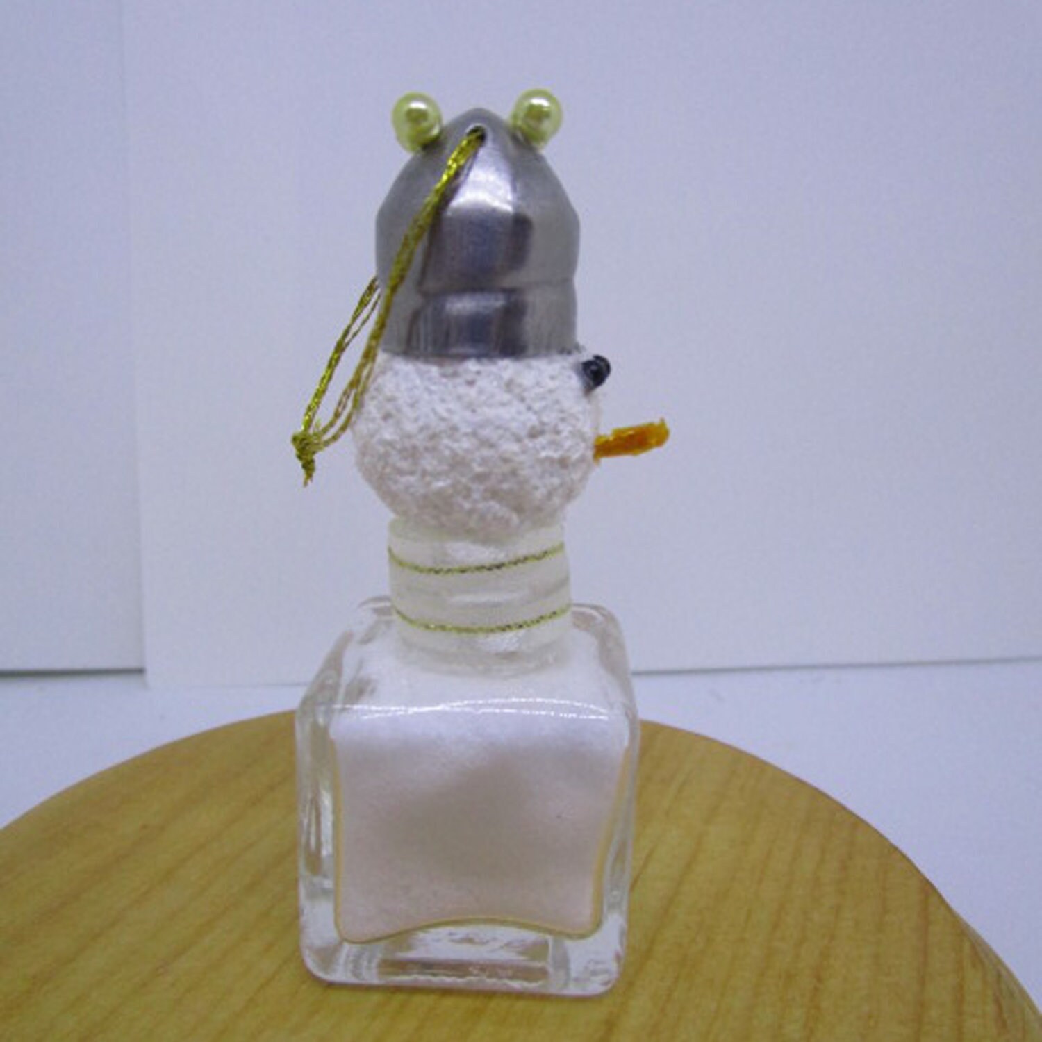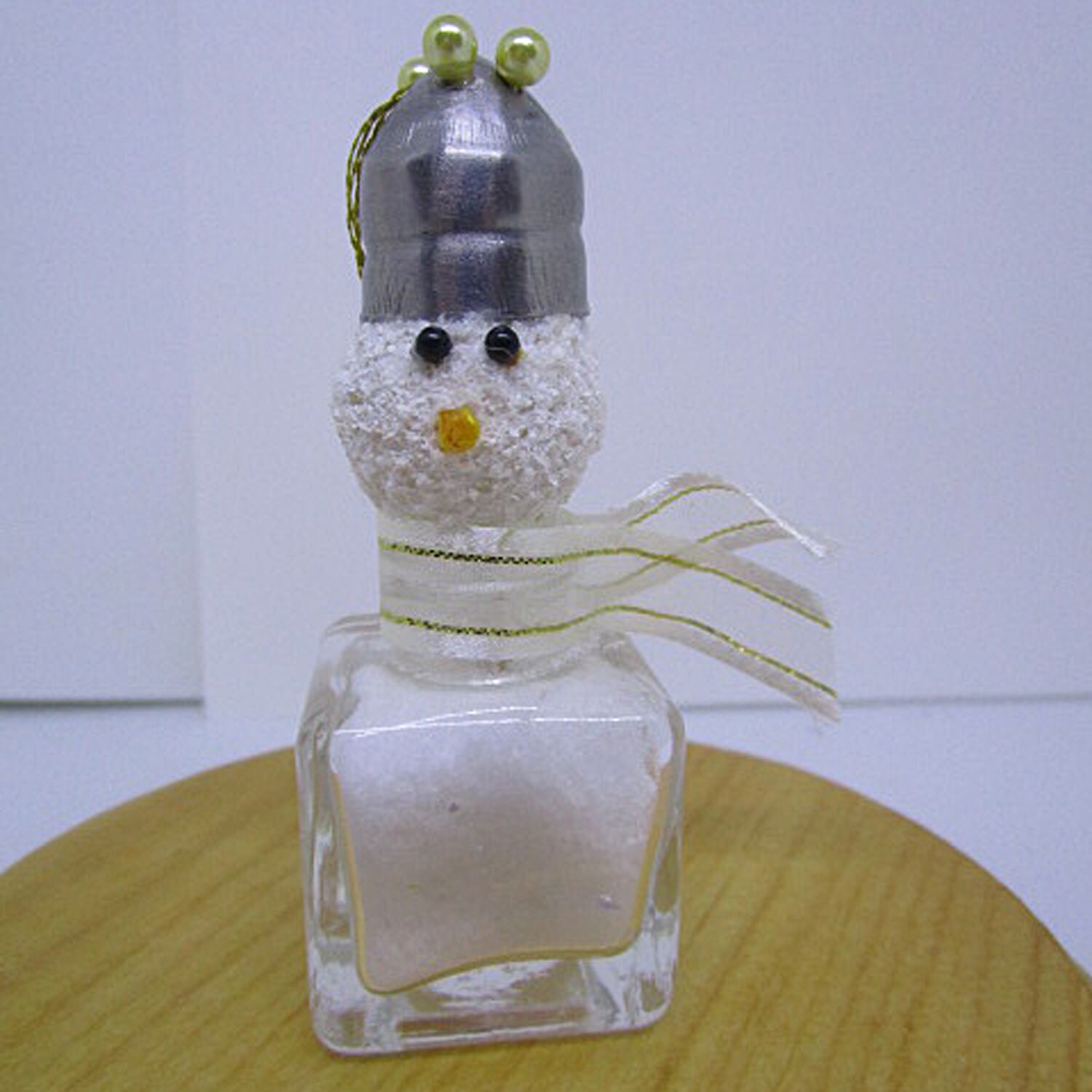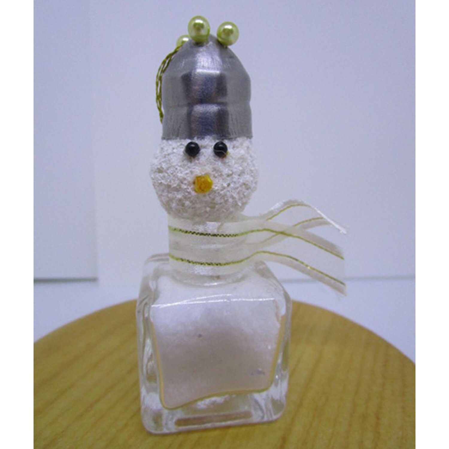 I crafted this quirkily regal snowman starting with a miniature glass salt shaker. I filled the shaker with artifical snow and a dusting of glitter flakes. I made the head covering a small styrofoam ball with snow paint. The eyes are straight pins with black bead tops and the nose is a toothpick. The hat is the salt shaker top that I secured with straight pins with pearl colored bead tops. I created a scarf using ribbon.