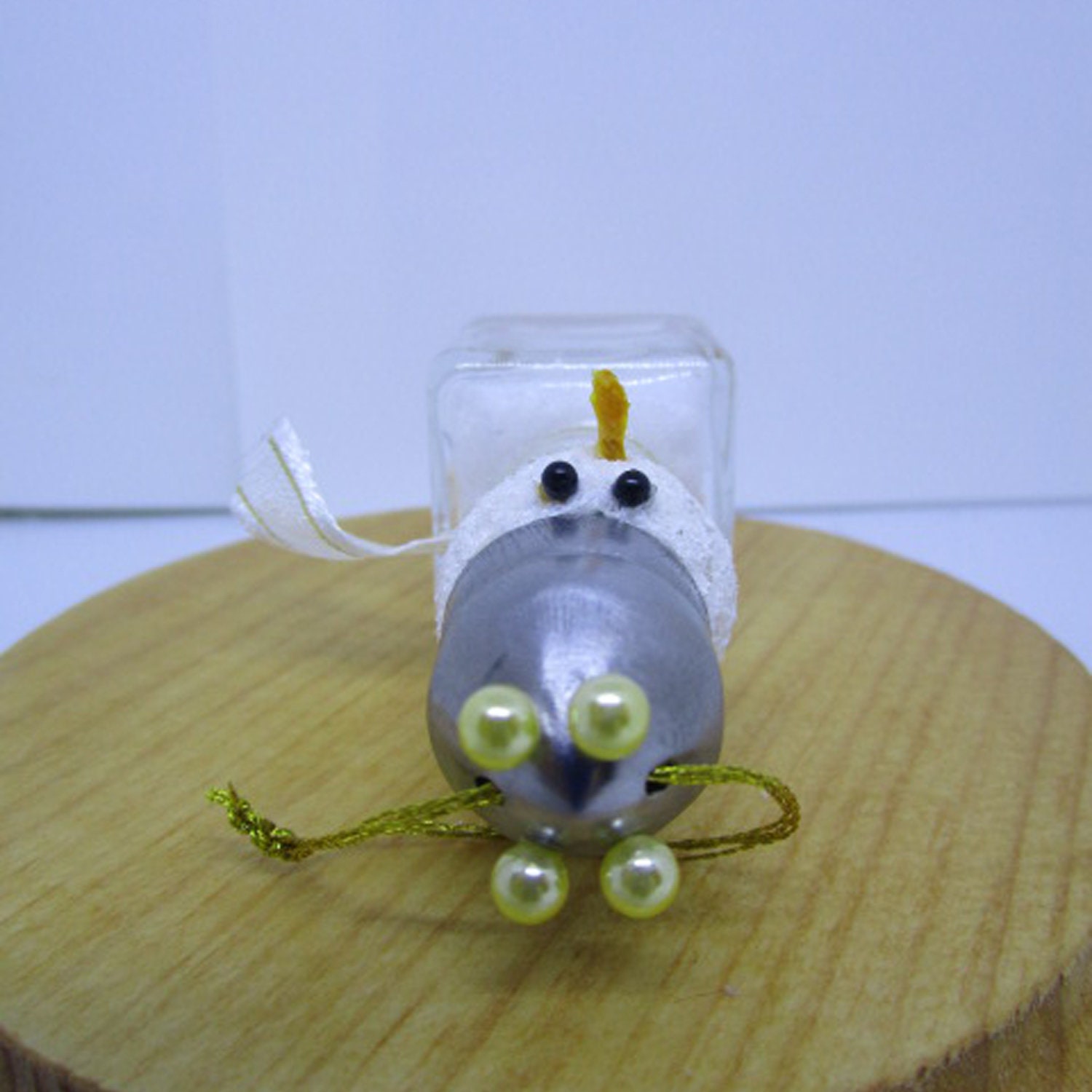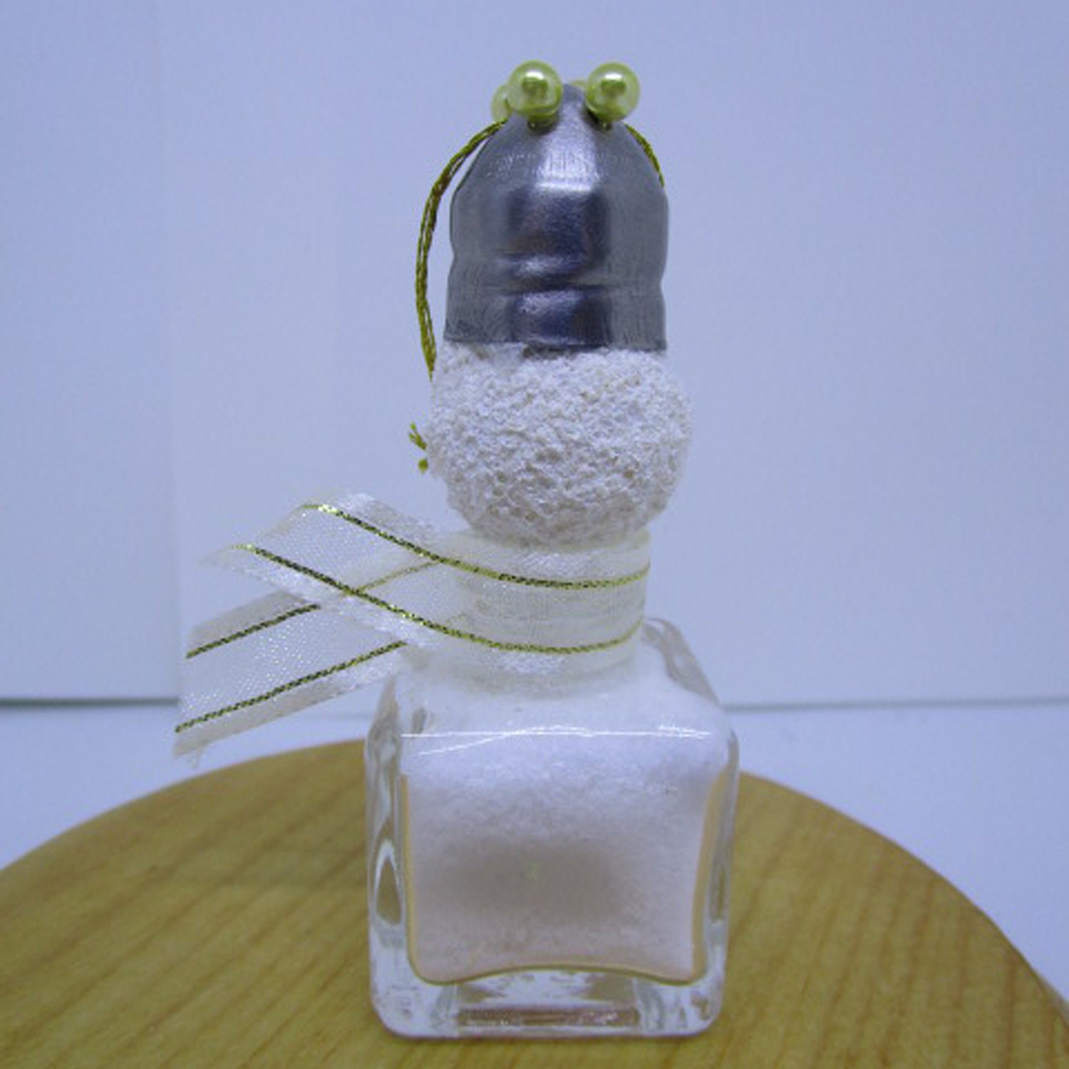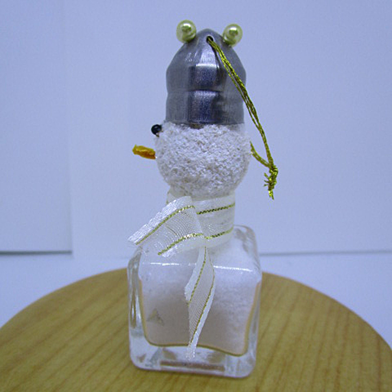 I crafted this quirkily regal snowman starting with a miniature glass salt shaker. I filled the shaker with artifical snow and a dusting of glitter flakes. I made the head covering a small styrofoam ball with snow paint. The eyes are straight pins with black bead tops and the nose is a toothpick. The hat is the salt shaker top that I secured with straight pins with pearl colored bead tops. I created a scarf using ribbon.
