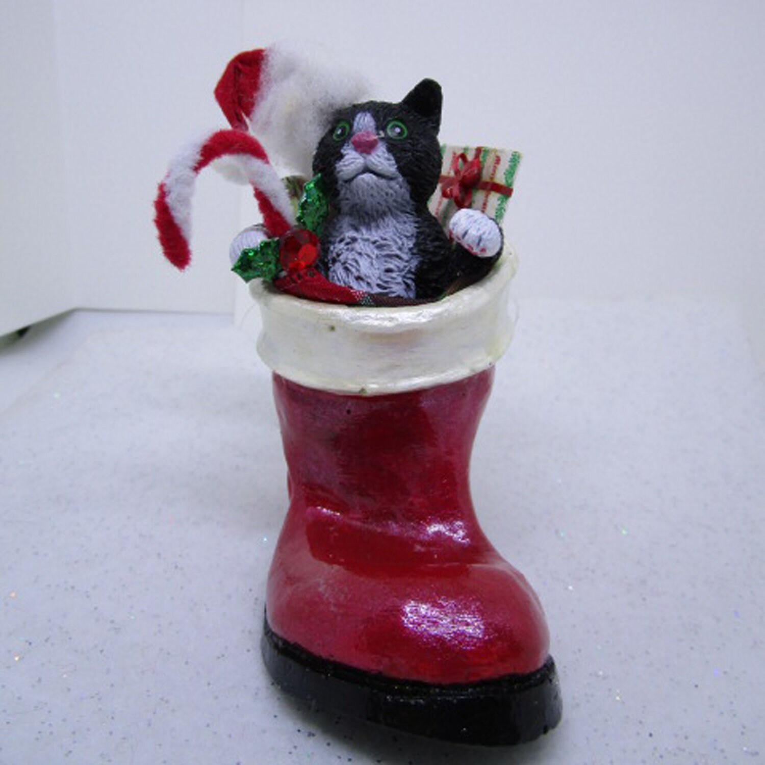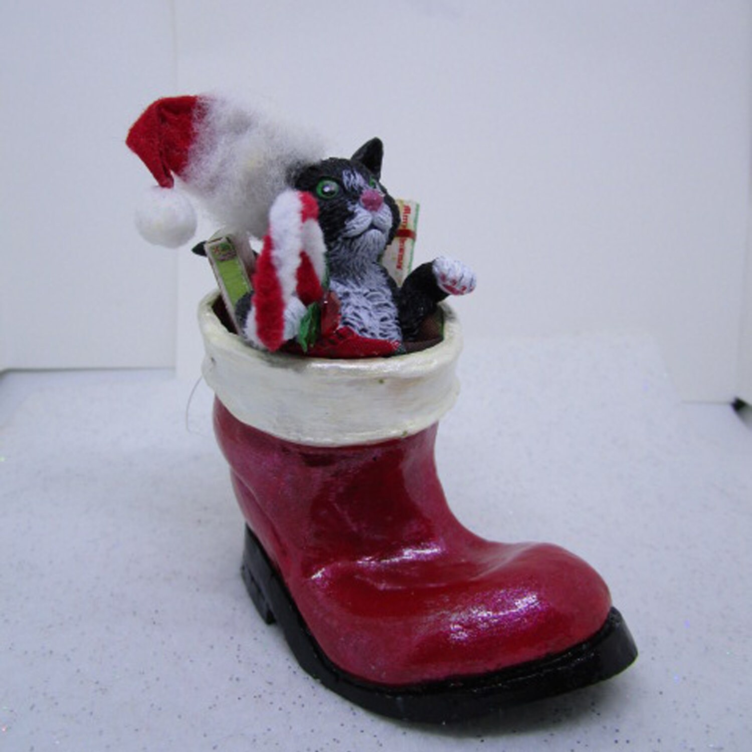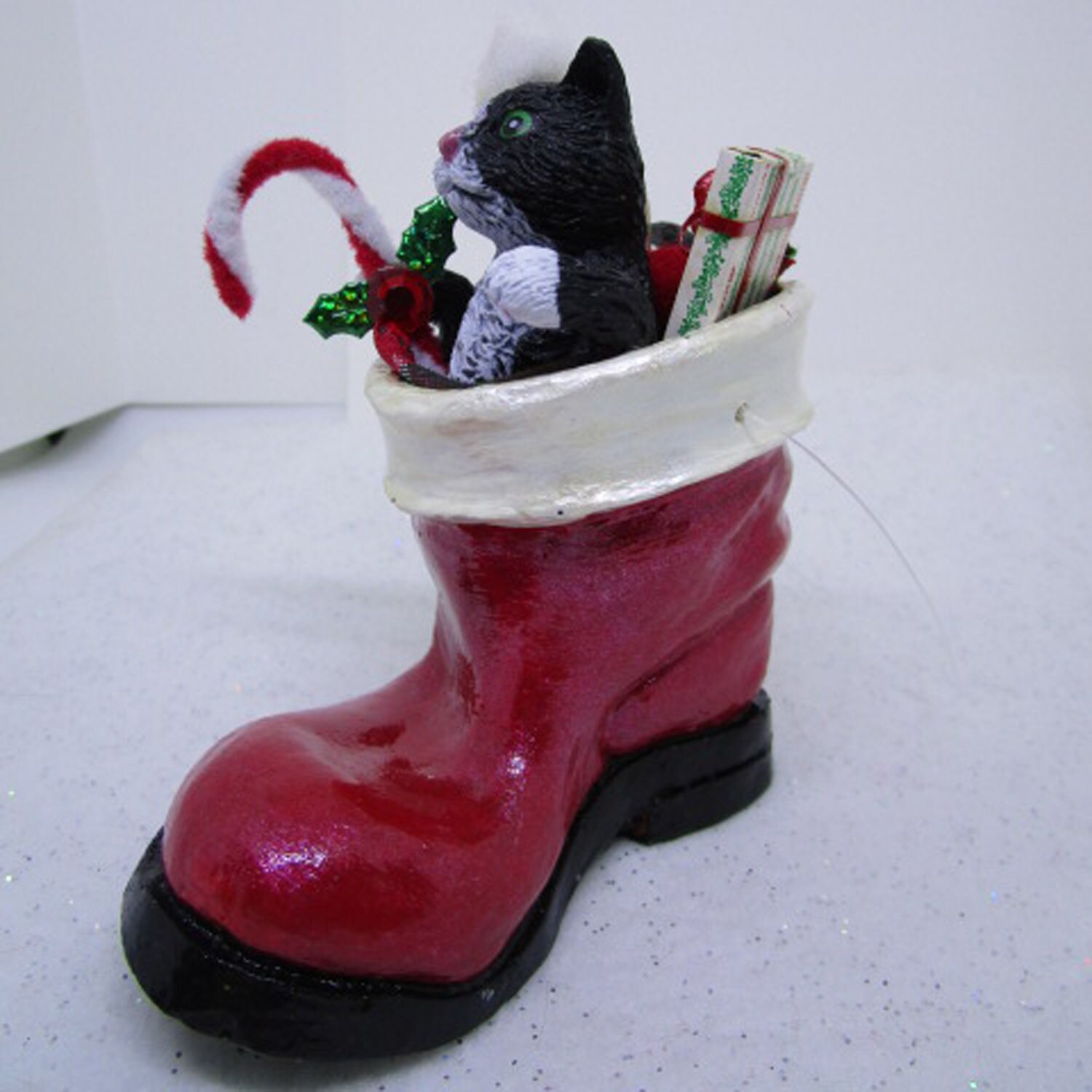 An ornament for cat lovers. When I got this Santa boot, it was a very dull red. I gave the entire boot several coats of fresh paint then sealed it with polyurethane. Next I glued a piece of plaid, fabric ribbon to the inside. Then the real fun began - filling the boot.