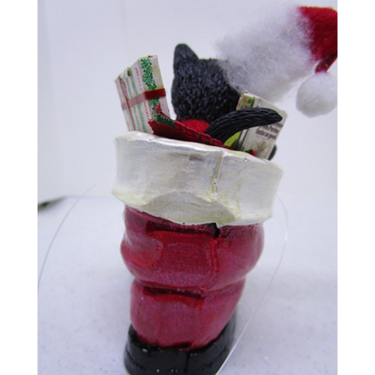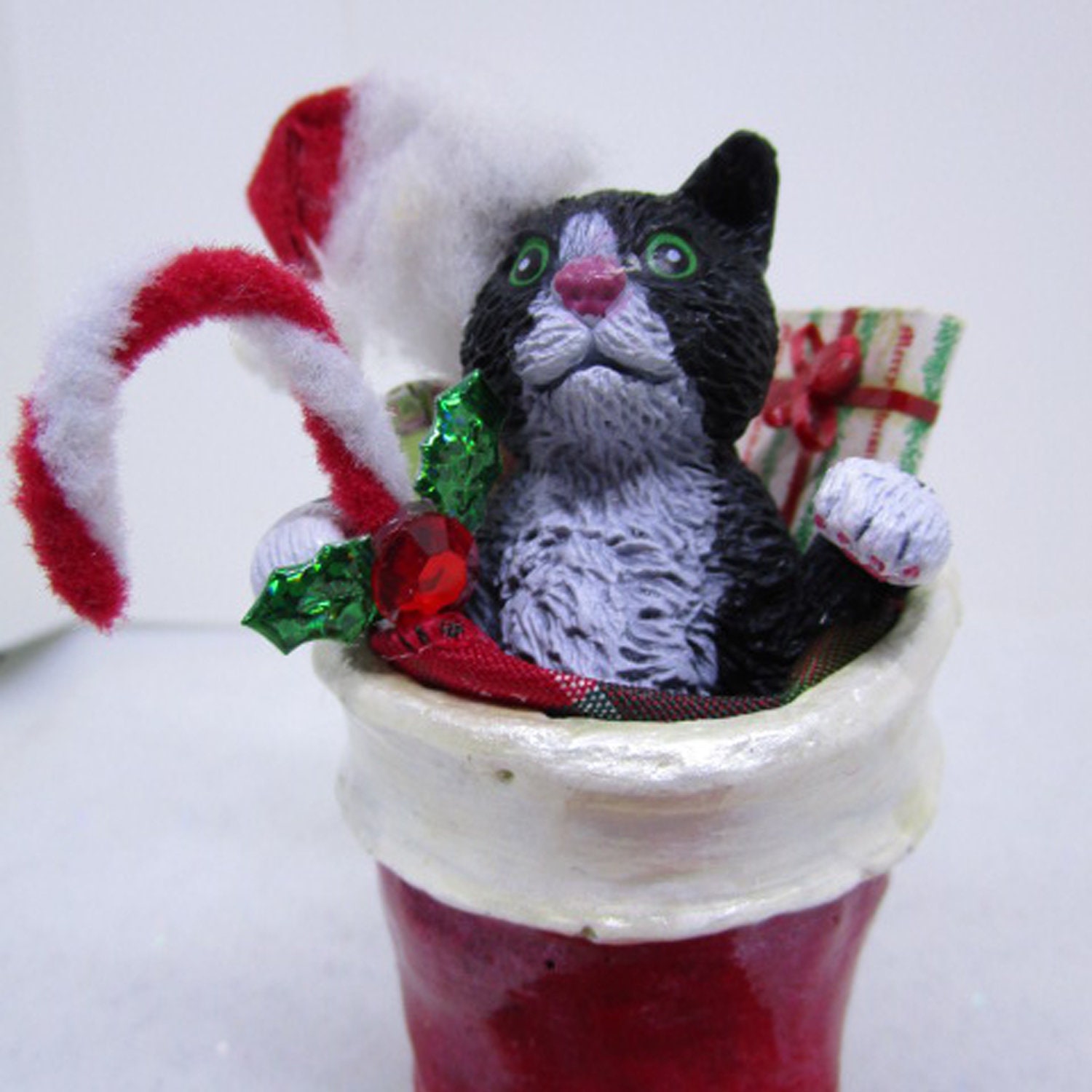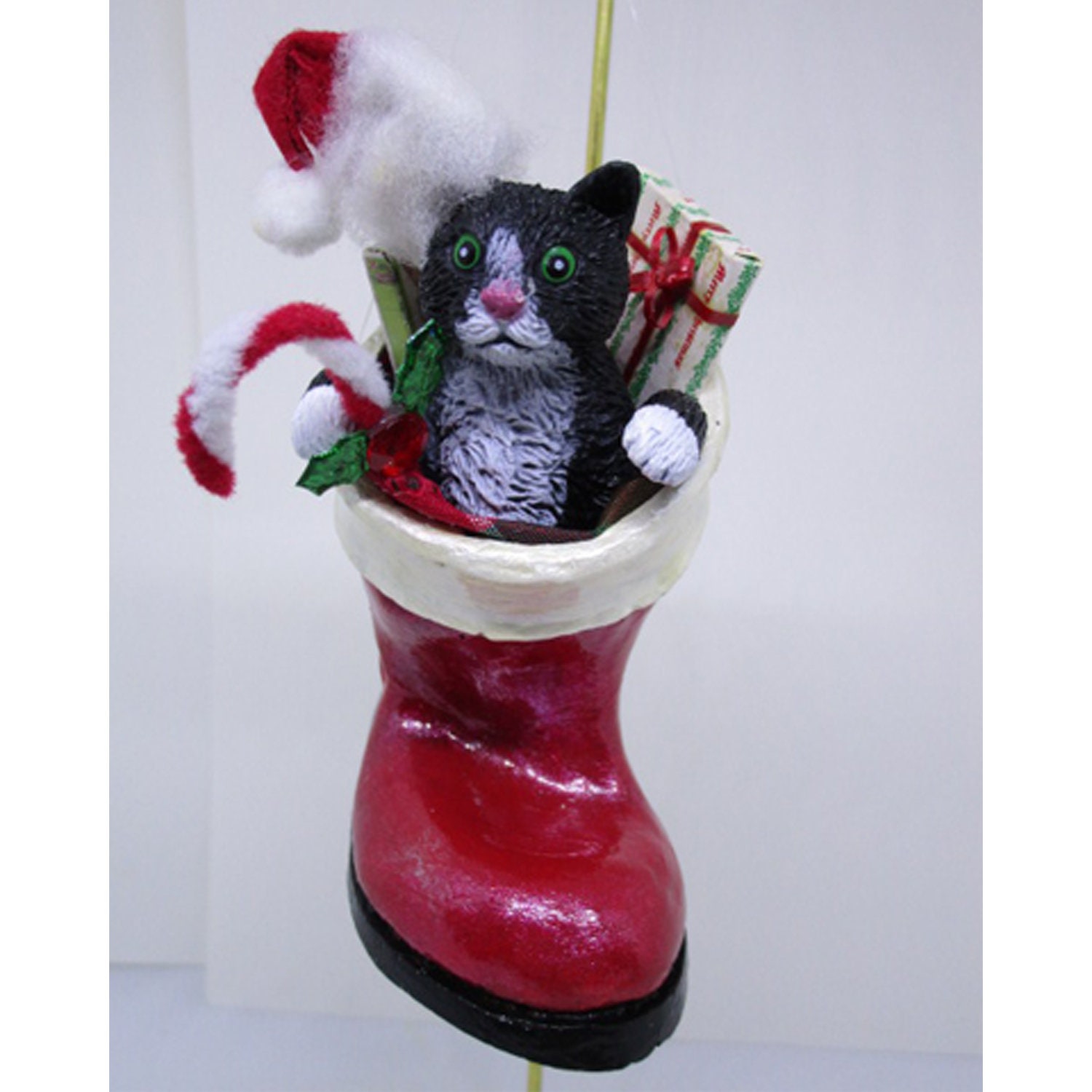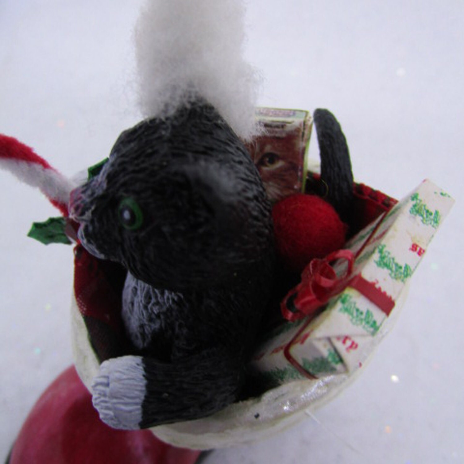 An ornament for cat lovers. When I got this Santa boot, it was a very dull red. I gave the entire boot several coats of fresh paint then sealed it with polyurethane. Next I glued a piece of plaid, fabric ribbon to the inside. Then the real fun began - filling the boot.