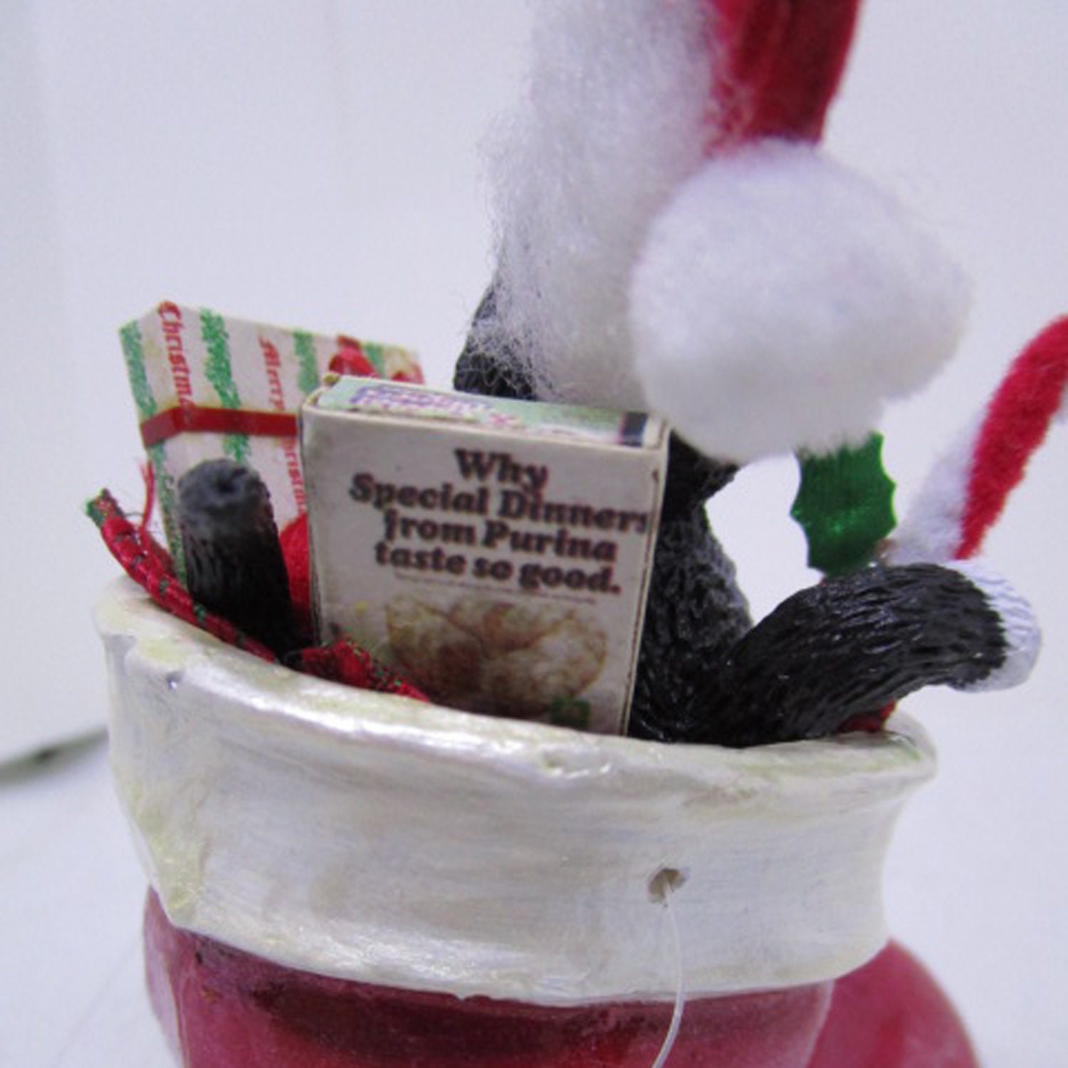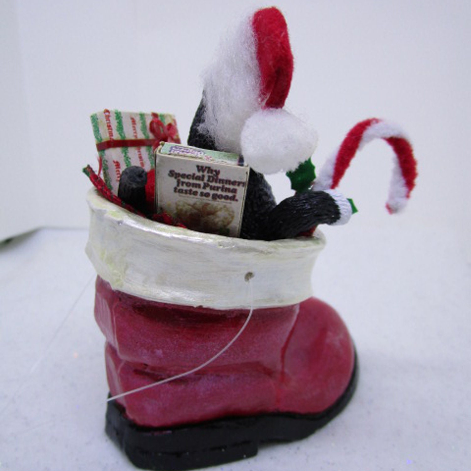 The Black and white cat gave up it's role of a finger puppet to become the focal point of this ornament. He put on a santa hat. Also in the shoe, is a pipe cleaner candy cane (one of my cats who happens to be black and white loves pushing pipe cleaners across the floor), a felt ball, wrapped package and box of Purina Cat Chow.