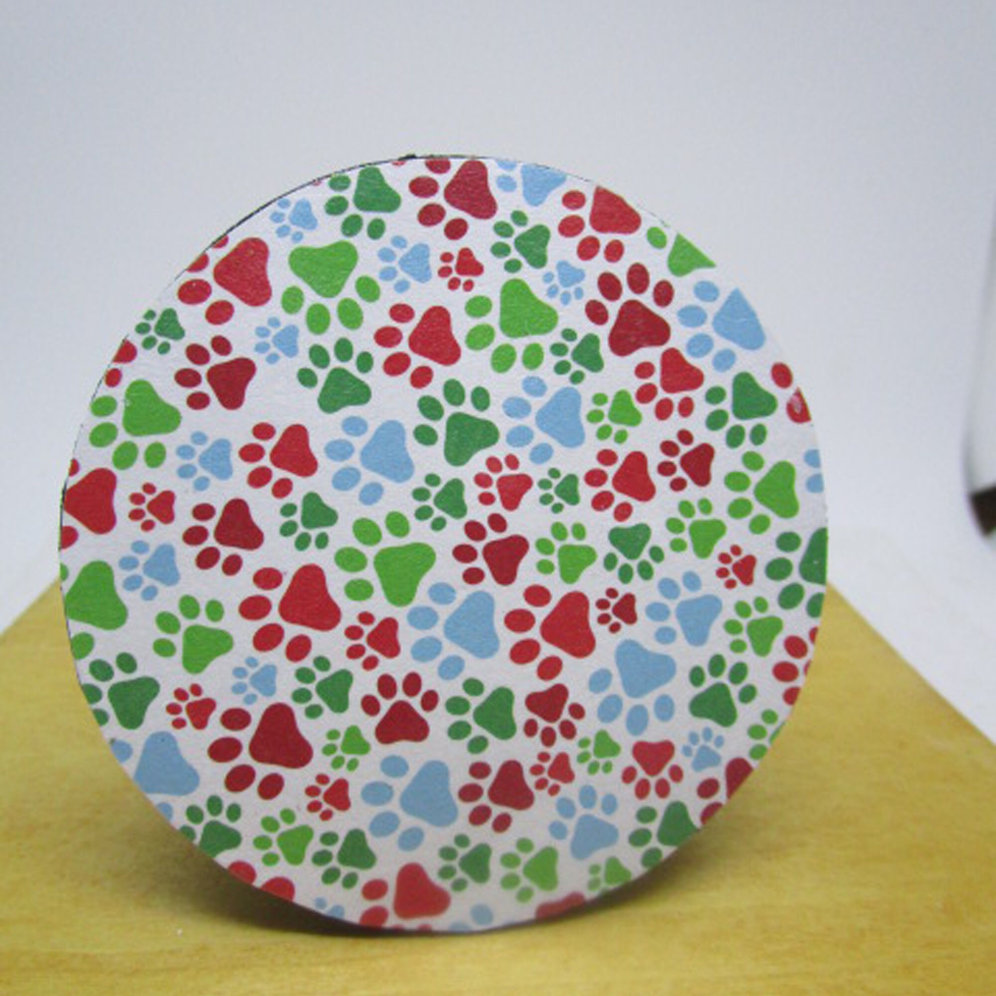 Marshall rides atop a Matchbox Fire Engine decorated for the Christmas parade with a present sticker and a miniature tree. Both the tree on the fire engine and the one lining the parade route are decorated with strands of plastic beads. The base is a wood disc. The top is painted and sealed with decoupage. On the bottom I added scrapbook paper also sealed with decoupage.
