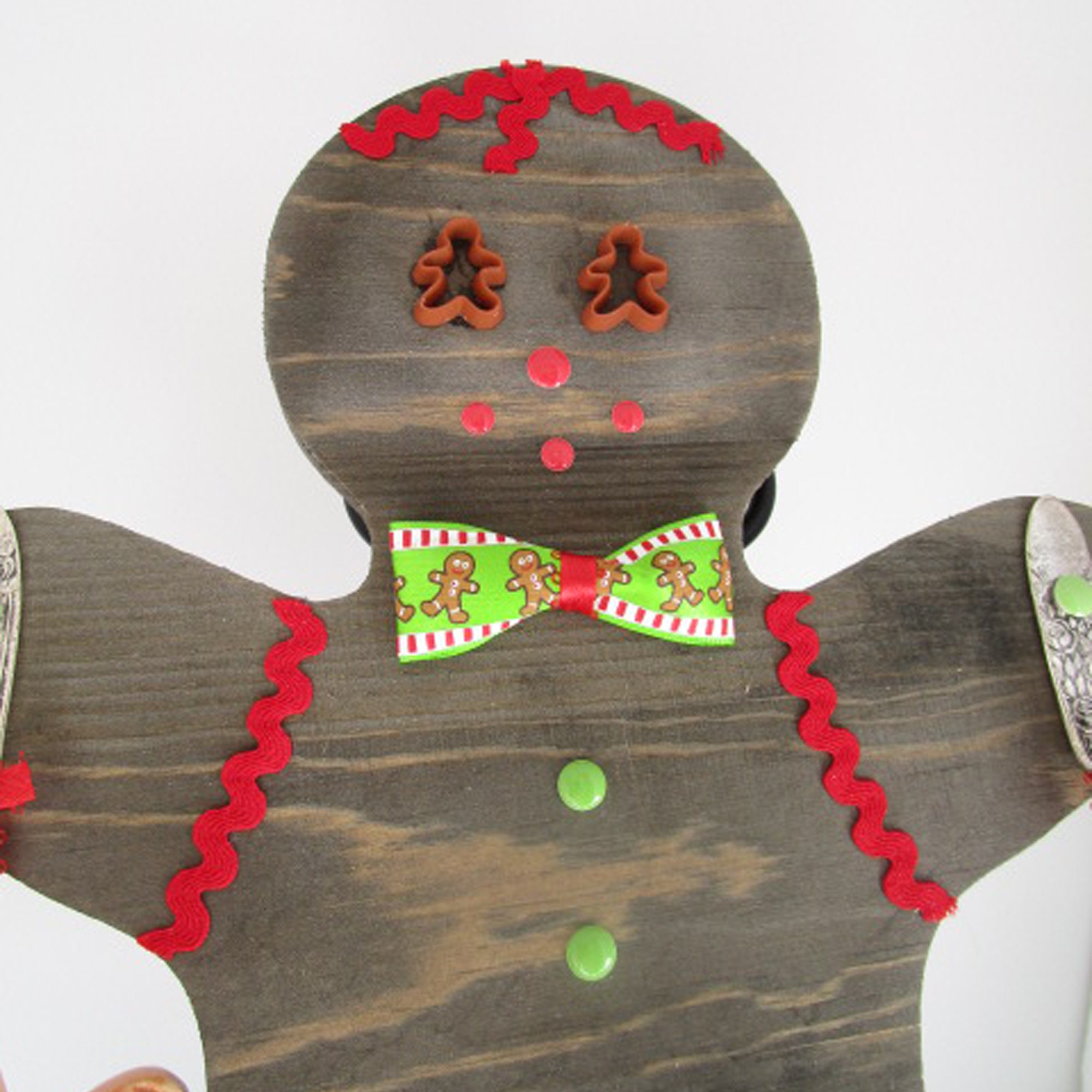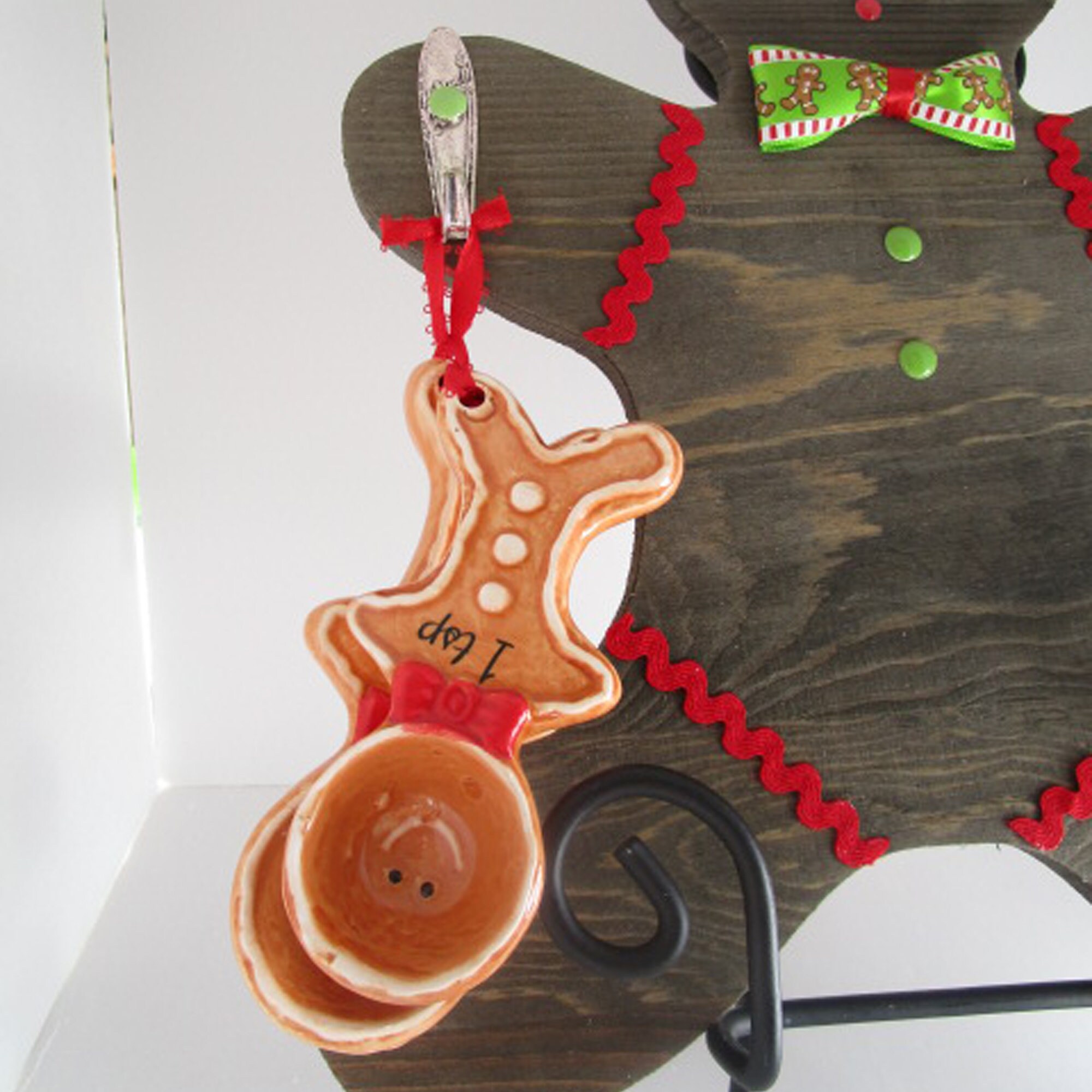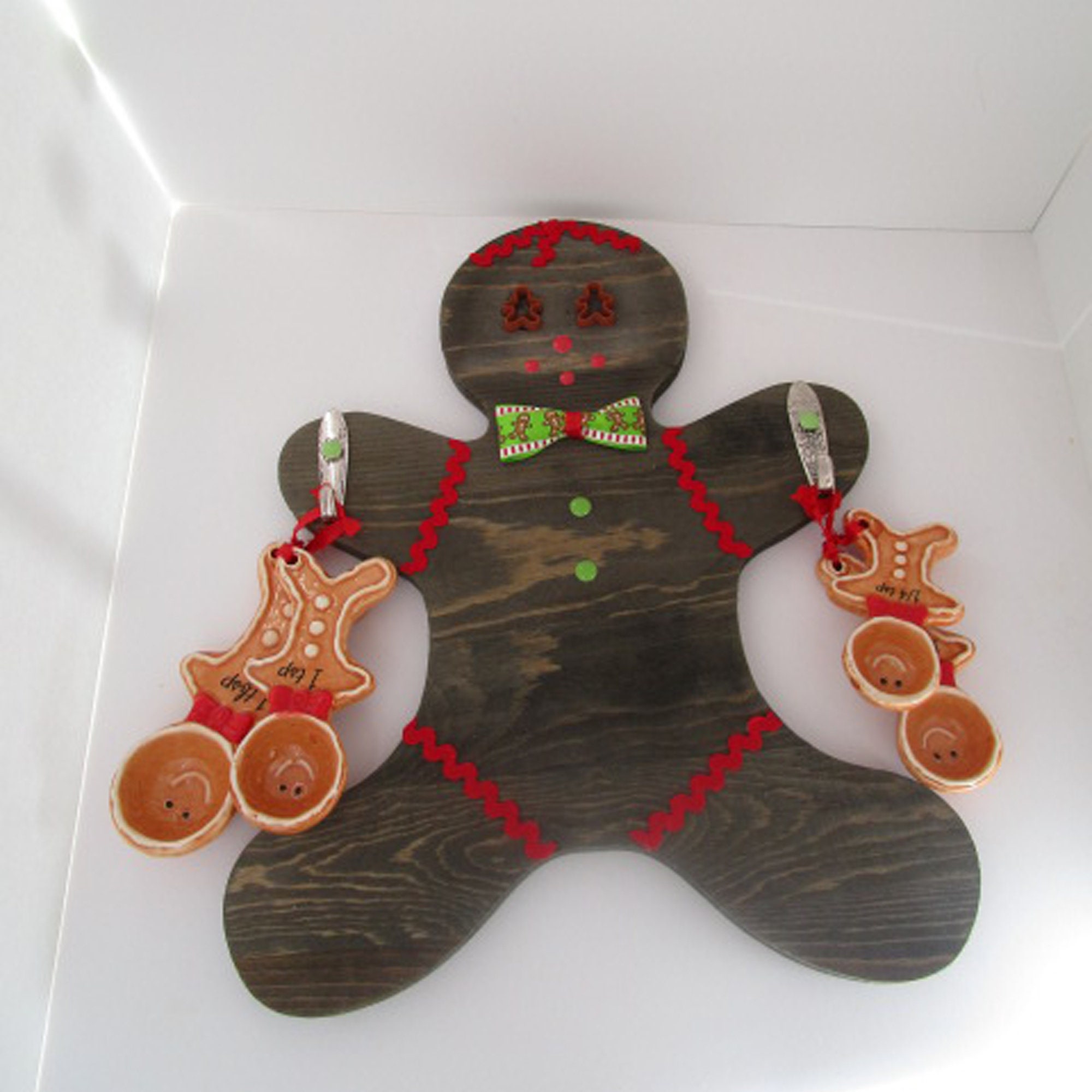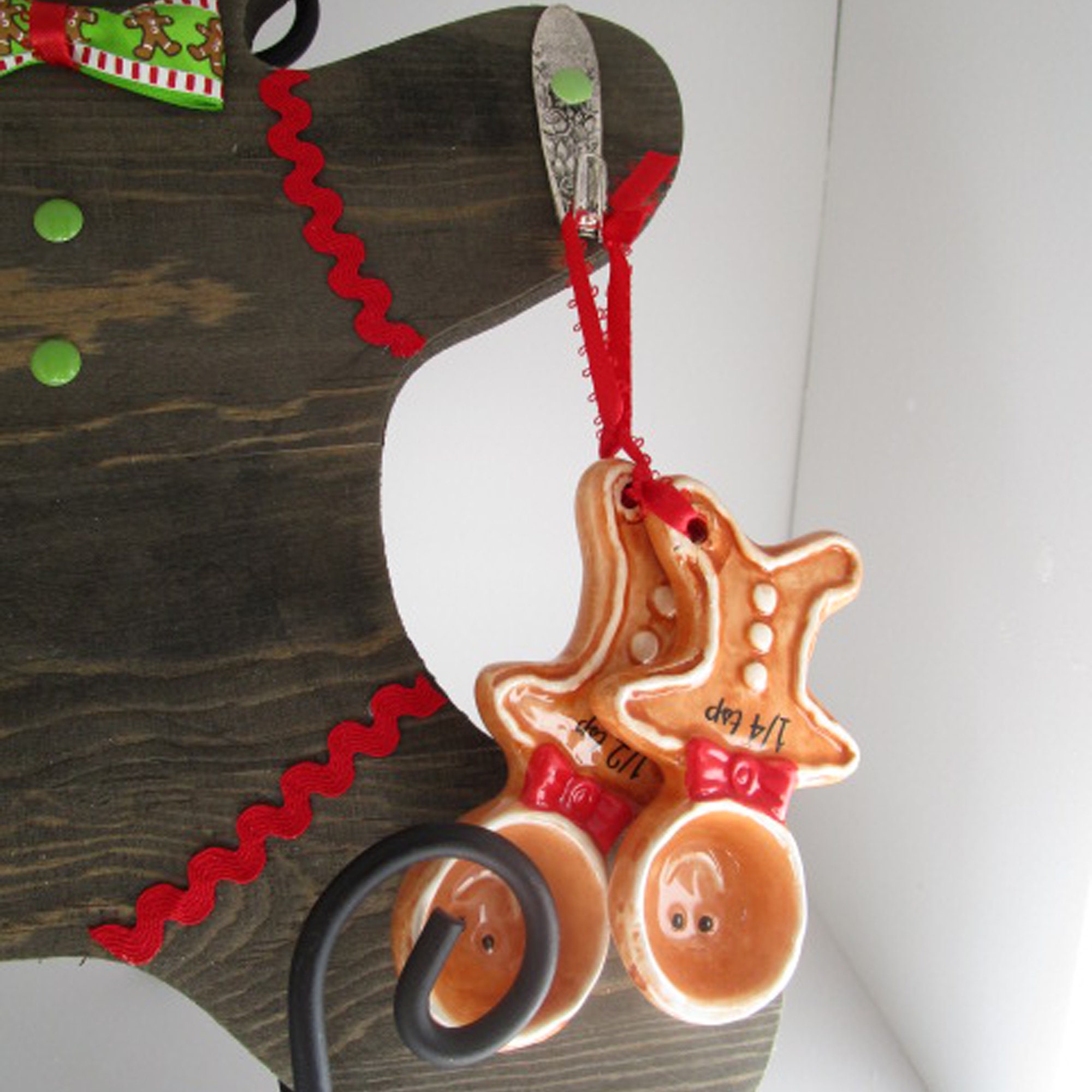 The measuring spoons are ceramic. The Gingerbread Man is wood. I used trim, miniature plastic cookie cutters, enamel stickers and a bowtie I made from ribbon to decorate him like a Gingerbread Man Cookie. The hangers are vintage spoon hooks. A sawtooth hanger is on the back but you could use command hanging strips.