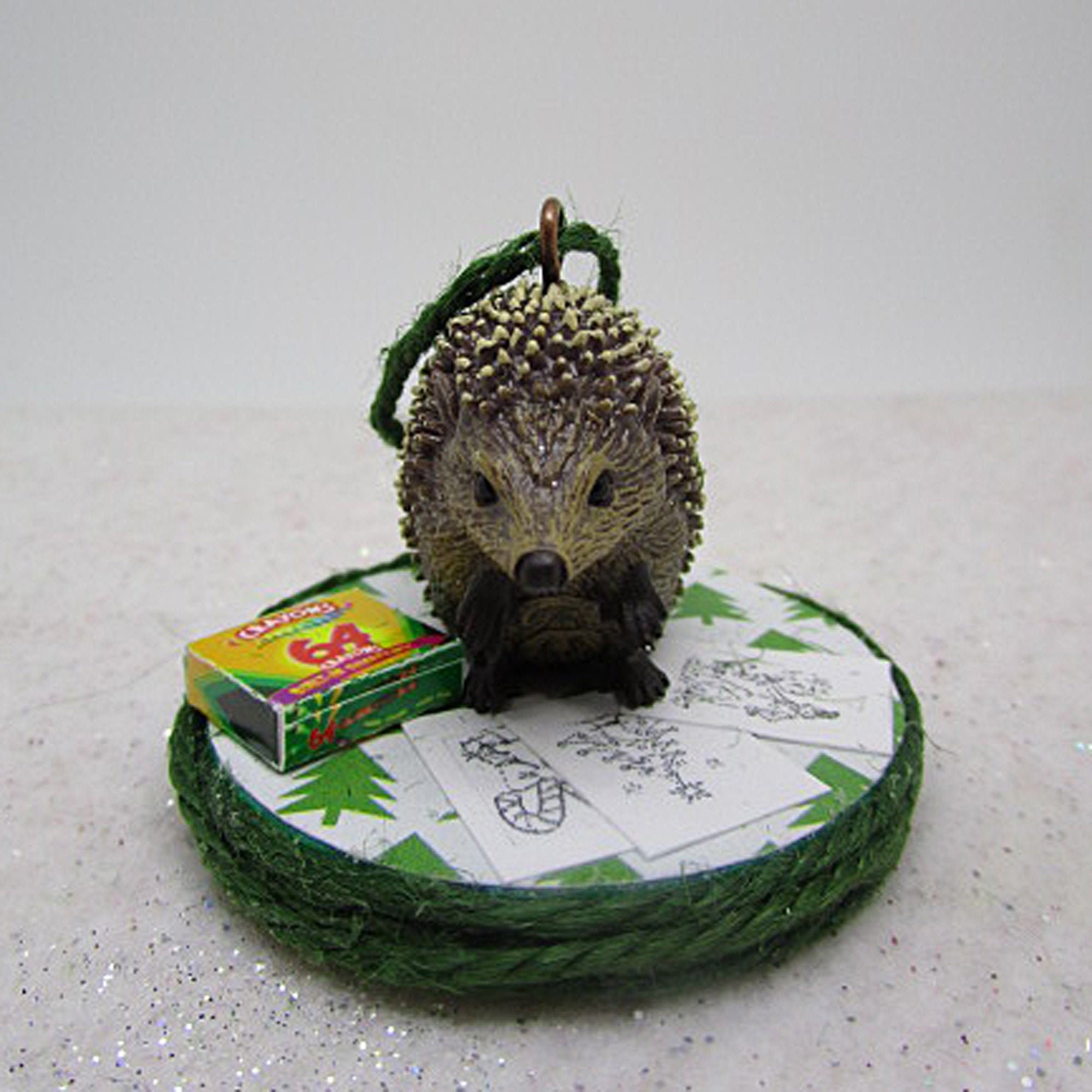 One of a kind, handcrafted hedgehog Christmas ornament titled: Gigi Prepares to Create Her Christmas Cards
