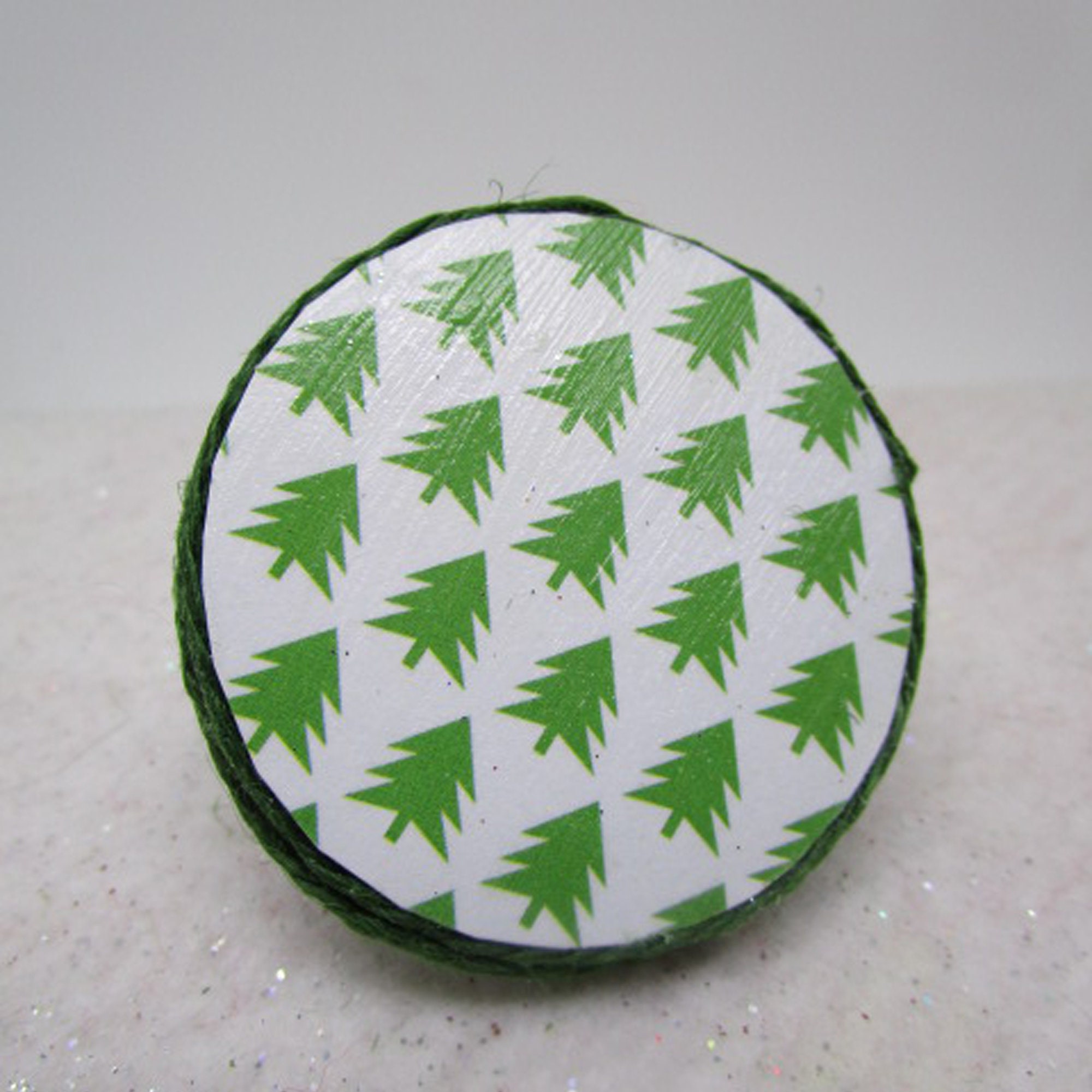 The base is wood. Scrapbook paper sealed with decopauge covers the top and bottom. I wrapped twine around the sides.