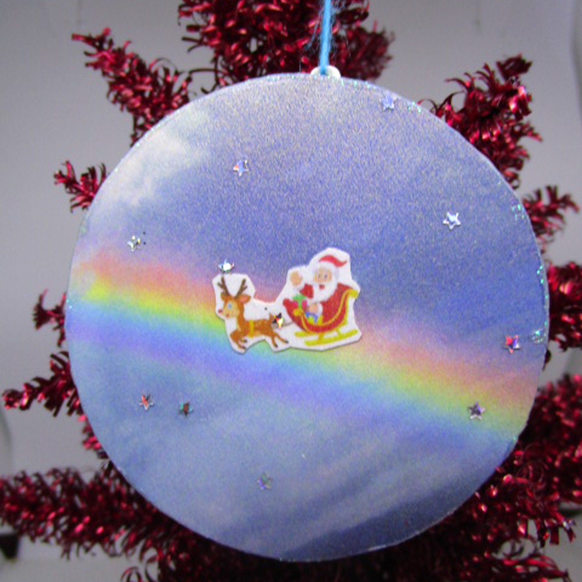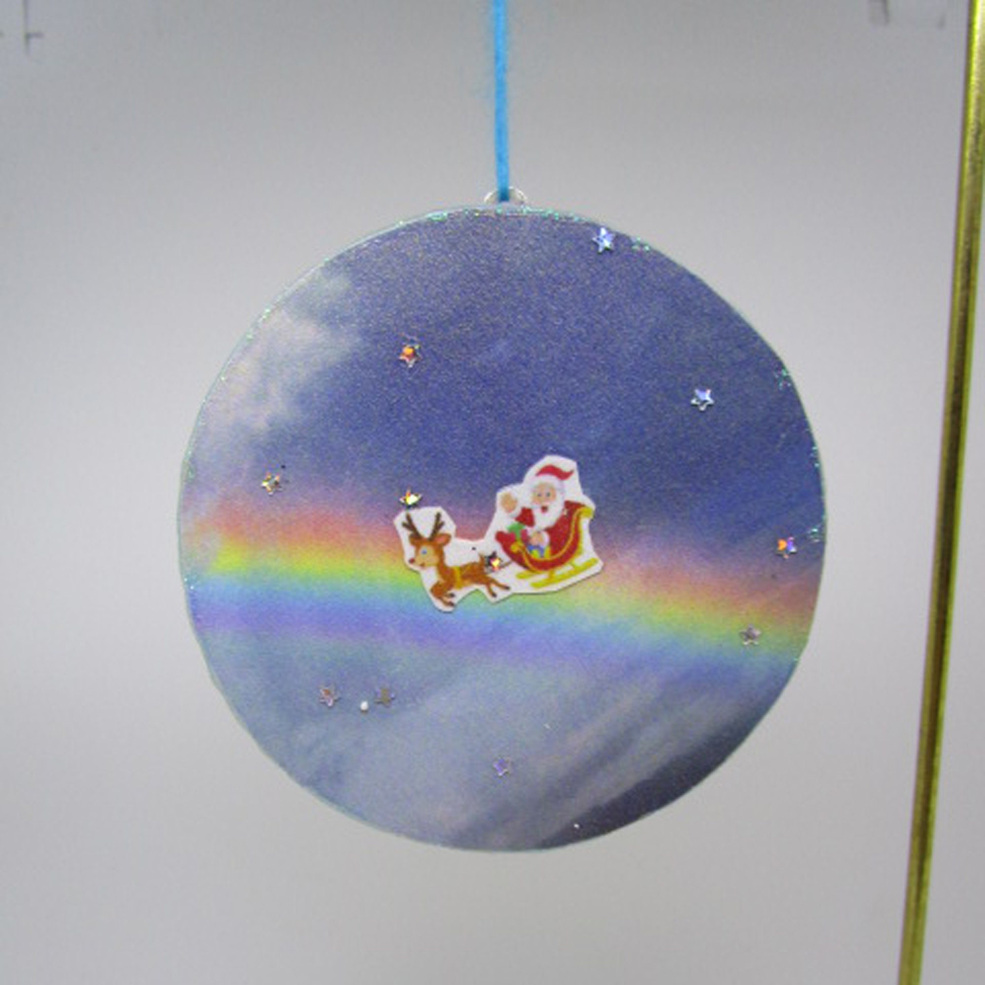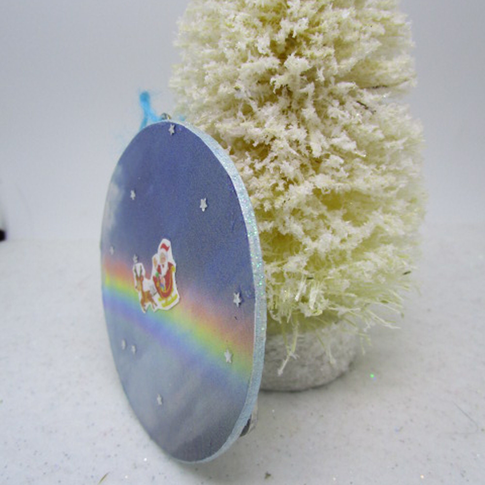 I'm describing this as an ornament but it could also be backpack art. It it also currently decorated for Christmas with Santa flying over the rainbow but can be customized. Santa can be removed. It can be personalized. Your child's photo can be added.