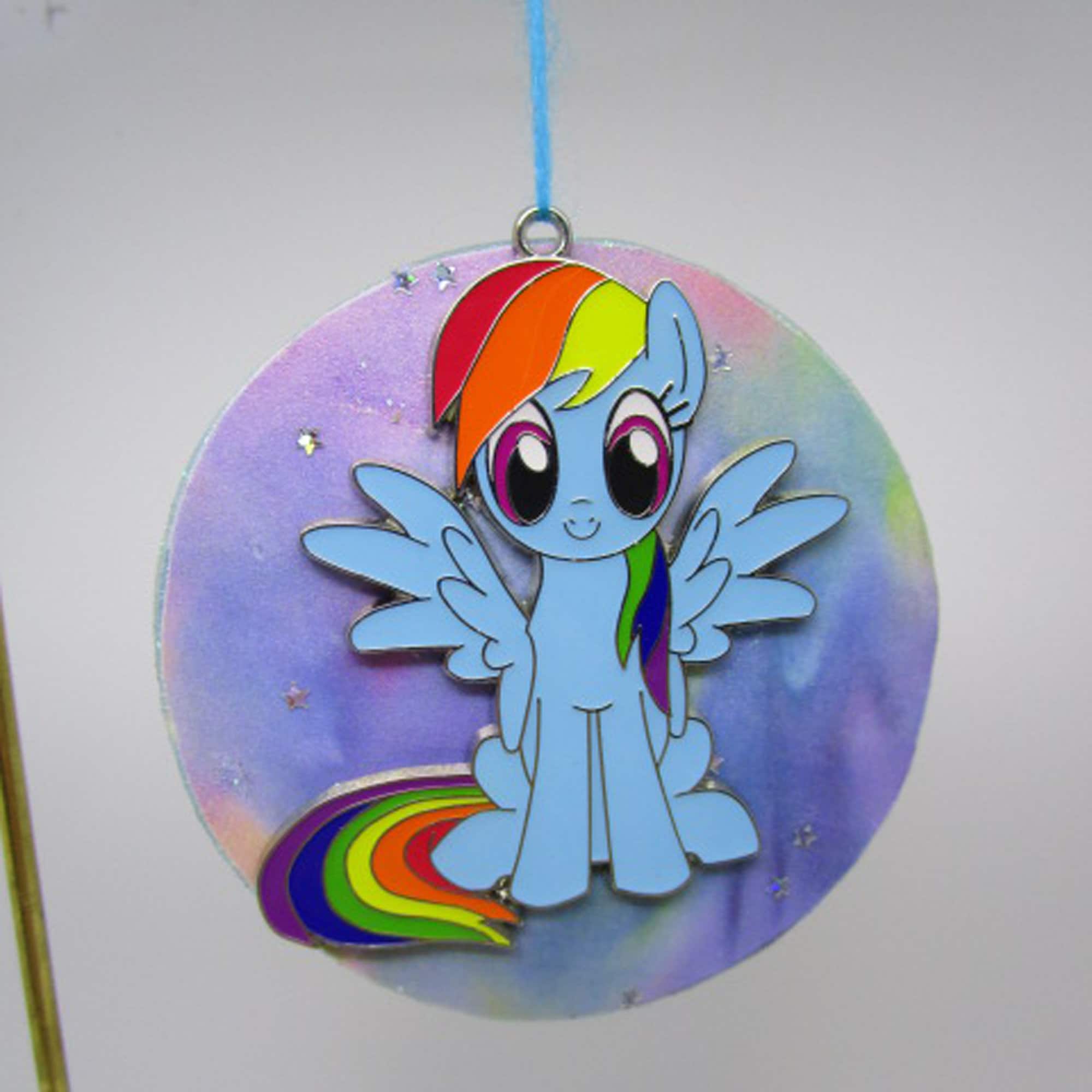 The painted metal Rainbow Dash is glued to a wood disc that I covered with rainbow themed paper that I added sparkly stars to and then sealed it with decoupage.