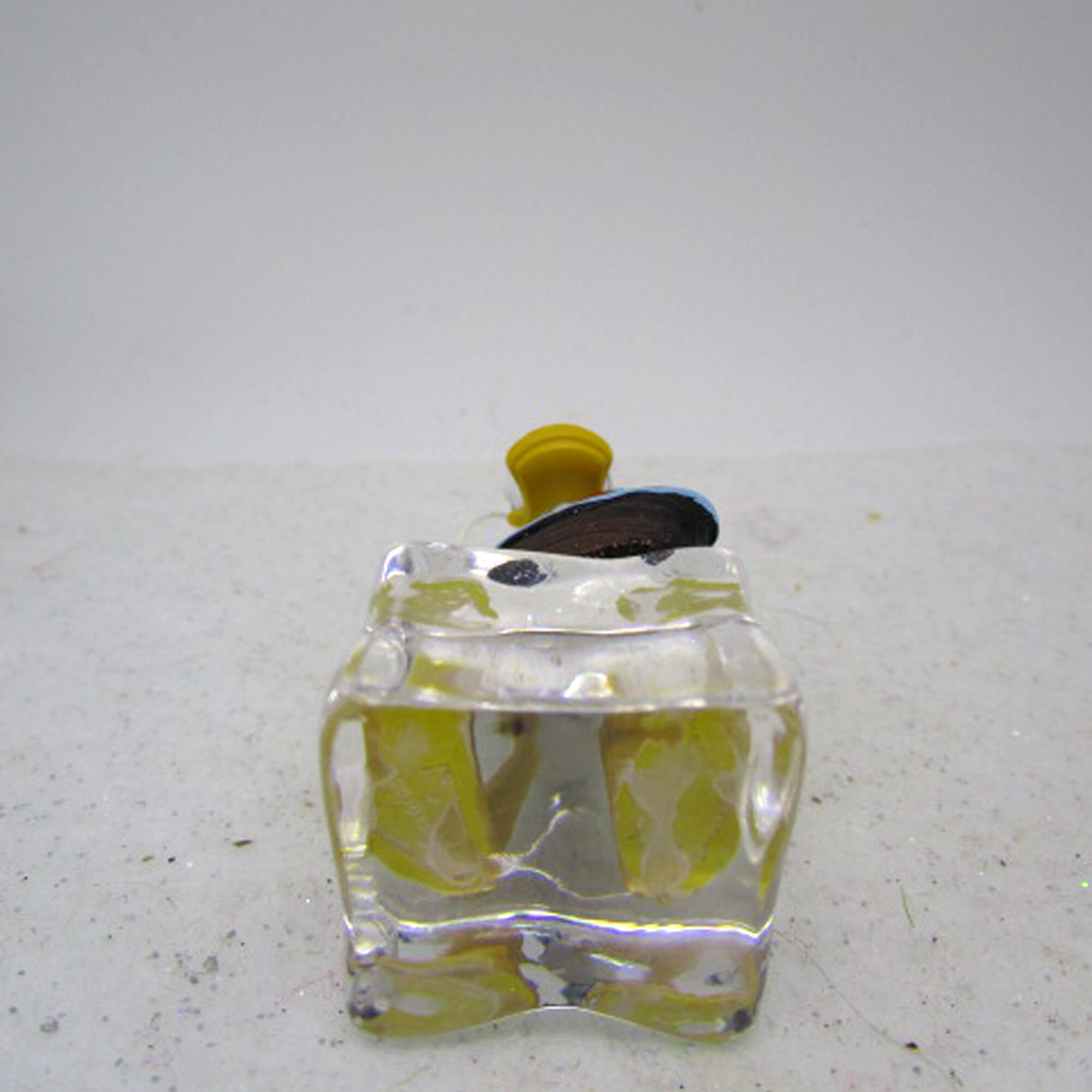 Donald is made of plastic. The sailboat is made of resin. I glued these to a clear acrylic cube.